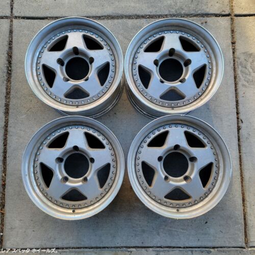 Made in Japan. Three piece design with center mounted on top, lip and barrel welded. Wheels are in decent condition but have typical rash, paint chip and corrosion on lips. New M6 Chrome hardware and valves included.