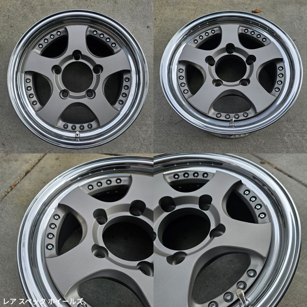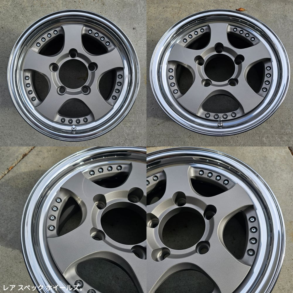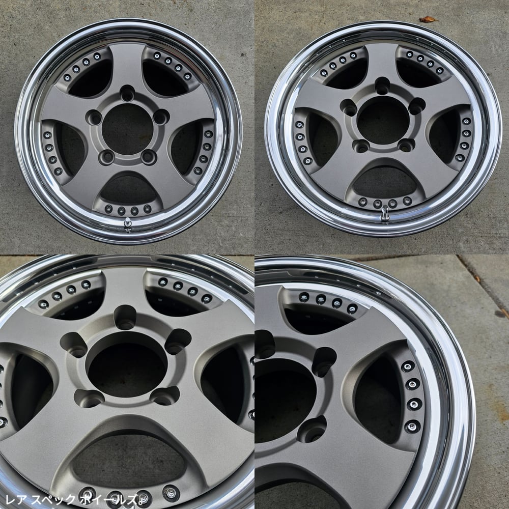 Refinished. Faces and inners stripped and coated in Gun Metal Grey Cerakote. One outer was damaged, weld split, and new 16x1.75" was custom made (3pc weld except one that one replaced). All outers were polished. New valves, nuts and inner spoke bolts. Original M8 Super Star hardware cleaned up and repolished.